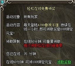 【活动内容】只要累计在线超过1小时就能领取50或100绑定元宝,领取后在线时间清0重新计算。可无限重复领取。