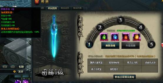 想要战力高人一等,帮派作用也不可忽视。帮派武功和帮派图腾都能增加战斗力。其中帮派武功可增加角色五行属性,而帮派图腾更能给角色增加战力加成,挂机刷怪的时候,在帮派图腾所在地图刷怪,可以获得经验加成的好处。
