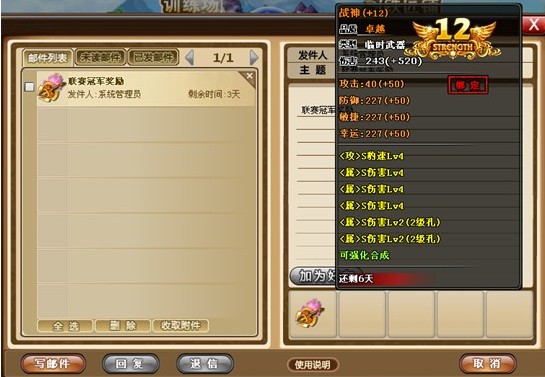 除了以上的种种好好东西之外,冠军组合还会获得超级极品的特殊奖励——使用期一周的神器“战神”,如下图!