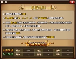 点击联赛按钮,即可查询联赛的具体资讯。积分越高,奖励越极品,奖品数量越惊人,还等什么,赶紧参加联赛吧!