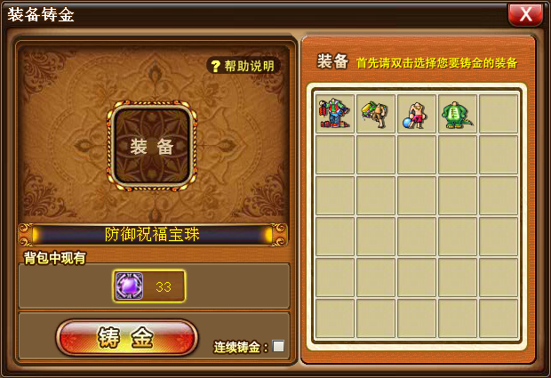 点击使用祝福宝珠,就会弹出装备铸金界面,轻松完成装备的铸金。