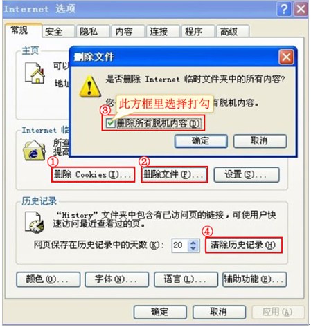 第二步:点击删除文件,将“删除所有脱机内容”方框中打上勾后再点击确认;