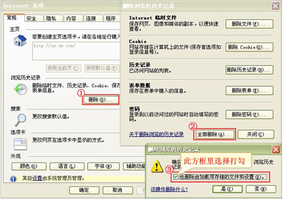 在常规页面点击删除,会自动弹出一个窗口点击上面的全部删除,全部删除的上面将“也删除由加载项存储的文件和设置”方框打上勾,再点击是,最后点击下方确认按钮。