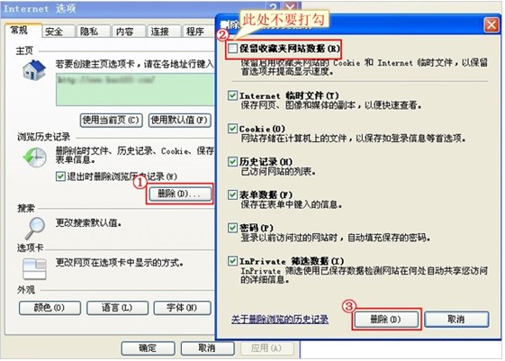 在常规页面点击删除,会弹出一个窗口,将“保留收藏夹网站数据”方框中勾去掉,再点击删除,然后点击确认即可。