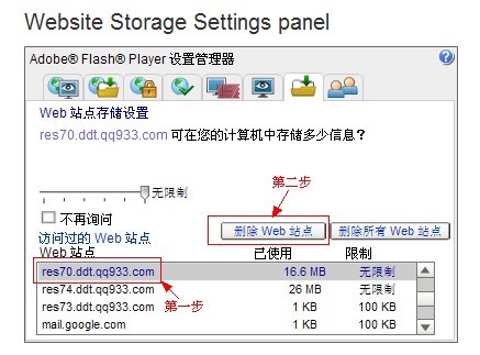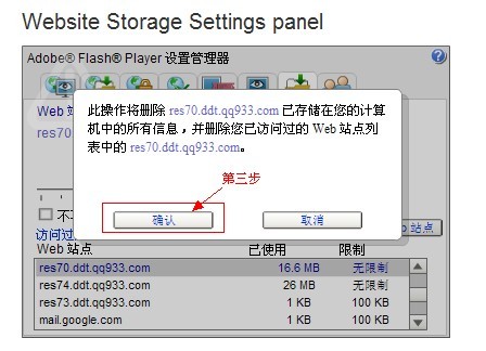 2.选中你要进入的弹弹堂服务器域名,然后点击“删除Web站点”会跳出图2,然后点击“确定”按钮就会把弹弹堂70服的游戏flash缓存清楚掉。