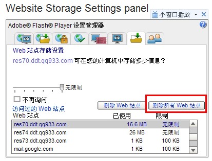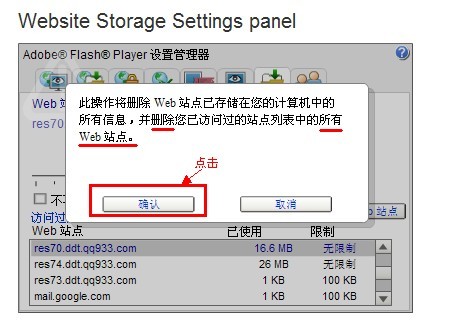 3.其他各服操作一样。如果你想一次性全部删除的话,就点击“删除所有Web站点”,然后再点击“确定”按钮即可删除所有的flsah缓存了。