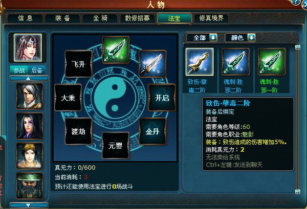 新版中,法宝玩法是结合内功修炼和外在装备属性的重要纽带。4399凡人修真前期角色战斗能力的提升主要靠装备的打造和加工,好在游戏装备获得和打造都十分丰富,只要参加副本战斗,高品质的紫色装备都会拥有,至于打造,在游戏内做金钱任务,买卖物品之后获得铜钱获得元宝都可以用来购买宝石。法宝虽然具备了装备的外在属性本质,但法宝和内功修炼分不开,只有修炼境界达到4399程度,开启了4399的境界法宝位,才能佩戴法宝。