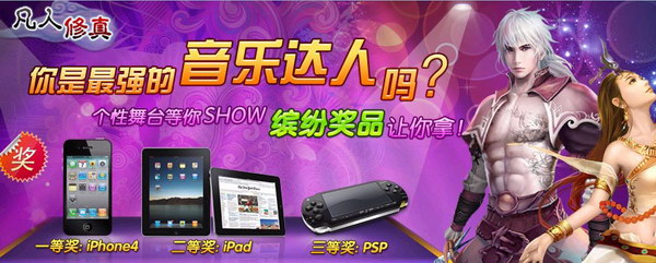 凡人修真主题曲《仙凡劫》是官方根据游戏内容邀请国内知名古典音乐创作室之作的年度巨献。在主题曲发行之后,才艺秀跨年度海选火爆登场,广大玩家期待已久的iphone4 16G版,ipad 16G版,近十万元宝奖励的大型声乐,动漫,视频才艺大赛已经启动,所有用户都有可以参加,只要加入4399凡人修真,做出自己的作品,都4399获得价值近1万RMB的游戏实物奖励。
