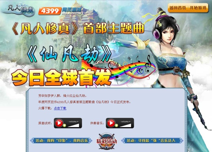 价值超过6K的iPhone 4大奖令人心动,而笔者在这里也给出一点tips:对于众多参与比赛的MM来说,反复聆听刚刚隆重发布的4399凡人修真主题曲《仙凡劫》可以获得很多的灵感!《仙凡劫》悠远浪漫的曲调讲述了修真者的远古故事:对征服命运的渴望、对百般修炼的耐心、对优雅仙容的追求、对人间的大爱!曲调开头从舒缓悠远、优雅动人,到中间的峰回路转,节奏逐渐变强,悲怆与轻快间隔,所有修真达人的心情,都可以从容不迫地体现出来。