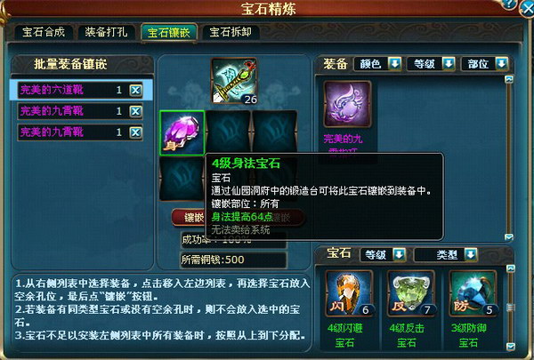宝石镶嵌,这个根据职业而定,在这里提前说一下,鞋子上最好每个人物都打上速度石头,速度快先出手可以占很大便宜。速度和控制如果跟上了,那4399是无敌的。 剑仙主镶攻击,连击。 魅影主镶敏捷,身法。阴阳主要镶嵌生命,攻击,防御。傀儡主镶嵌生命,防御。天师主镶生命,防御,暴击(回春时候暴击能加很多血)。