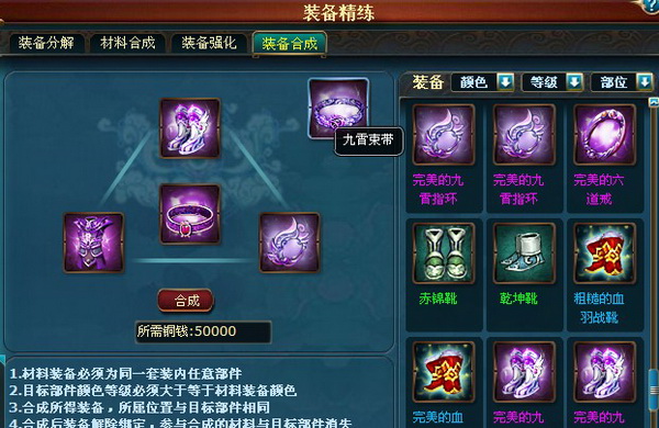 然而全新的装备合成系统将彻底改变这一切,4399凡人修真仙园锻造台>装备精炼,将增加一个全新功能“装备合成”。 “装备合成”:用多余重复的套装部件合成同套装内的指定部件,主要合成规则如下:三件相同套装相同部位材料装备+一件目标部位装备=一件该套装目标部位;材料装备必须是同一套装内的任意相同部件;目标部件影响合成结果,即合成后所得装备必定与目标部件位置一致;目标部件的颜色等级必须大于等于合成材料颜色等级;目标部件可为任意装备,即不限制是否与合成材料同一套装;合成后,材料装备和目标部位装备均会消失;合成后所得装备的品质(粗糙、精良、完美等),由参与合成的3件材料装备决定(在材料装备最低品质~完美品质区间4399取值);合成后所得装备的绑定状态为“装备后绑定”。