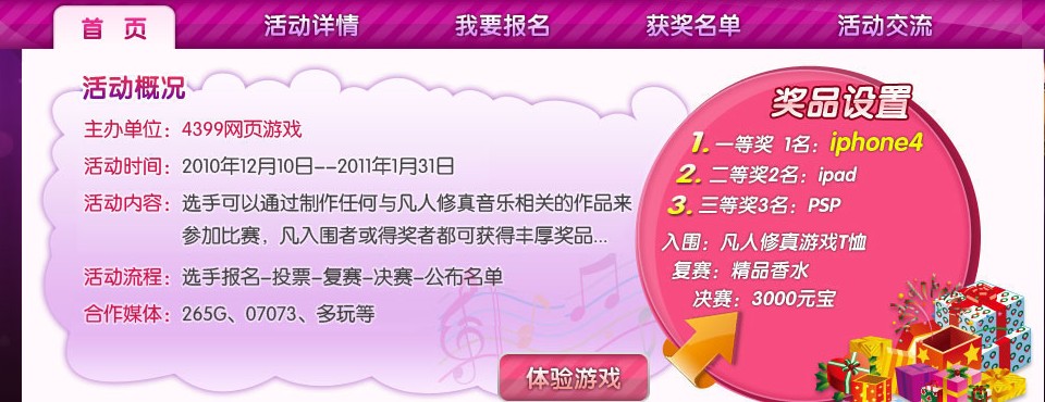 4399凡人修真音乐达人活动自12月10日开赛以来最给力的参赛者沈幽兰MM也给大家一些参赛的路子,对此GM哥深表赞赏,每个路子做到参赛者中的最好,都很有可能免费赢得iPhone或者iPad哦!更有10W元宝大奖在等着所有参加比赛的人,得奖率将近100%。下面由幽兰MM给跃跃欲试的大家一点TIPS吧。