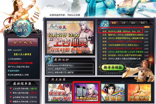 4399凡人修真官网圣诞挖宝妙计:注册一个4399平台通行证(可同时玩最具人气的御剑江湖、梦幻修仙、弹弹堂、英雄远征、明朝时代、藏域等十余款游戏)并登陆4399凡人修真官网,在页面上找到如图所示红色框内的链接,进入后既可选择作为参赛者参赛,亦可选择作为参赛者的粉丝投票、论坛盖楼,都4399获得包括苹果多款产品在内的10万大奖。
