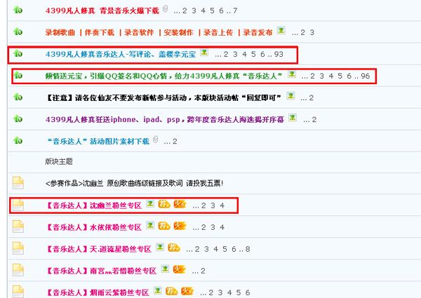 4399凡人修真官方论坛圣诞挖宝妙计:到凡人修真官方论坛如图所示的音乐达人活动专区,有本次活动的两个重要子活动携豪礼正在开放。其一,在4399凡人修真官方论坛的音乐专贴中,针对自己所支持的选手,就参赛作品写下自己的心声,让大家都知道你在背后坚定不移的支持着他/她,通过发帖来对支持者的参赛作品进行评论,并且附上贴图,整百盖楼送100礼券,盖楼幸运奖还送200元宝;其二,按照官方所给的内容来设置个人的QQ签名和QQ心情,在规定时间内完成QQ签名或者QQ心情的宣传,即可奖励60礼券,还4399从参与者抽取5名幸运玩家,奖励1000元宝。