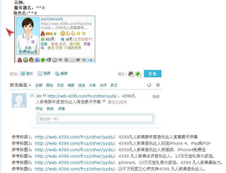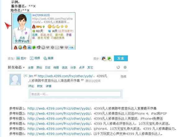 吟啸千里,一呼百应,凭的是QQ签名和QQ空间、QQ微博。到4399凡人修真官方论坛,按照官方所给的内容来设置个人的QQ签名或者QQ心情,并且在该帖子按照要求发布回帖;经过凡人修真GM的审核;另发动好友改QQ签名,拿贡献奖100元宝;需经过官方考核。为4399凡人修真音乐达人创造专属的QQ空间,带上4399凡人修真音乐达人的背景图片,或者相关图片,将截图到活动区,经过官方考核,优秀者可以获得贡献奖100元宝。让元宝飞,精彩活动无限在4399游戏平台,同台共献的还有明朝时代、傲视天地、弹弹堂、热血三国、凡人修真、梦幻修仙 、战将传奇、飞天西游、洪荒神话、傲视千雄、御剑江湖、英雄远征、明朝传奇藏域等二十多款时下最热门火爆的网页游戏。