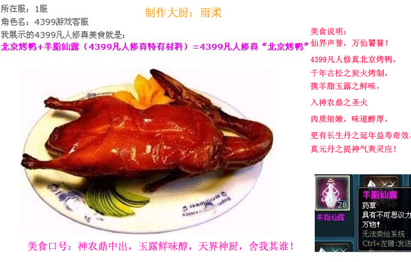 好,现在放出第一套4399凡人修真美食:凡人背景烤鸭(本文第一张图是也)。北京烤鸭+羊脂仙露(4399凡人修真特有材料)=4399凡人修真“北京烤鸭”。美食说明:仙界声誉,万仙饕餮!4399凡人修真北京烤鸭,千年古松之炭火烤制,携羊脂玉露之鲜味,入神农鼎之圣火,肉质细嫩,味道醇厚,更有长生丹之延年益寿奇效、真元丹之提神气爽灵应!雨柔大厨师口味有一点点重哦!