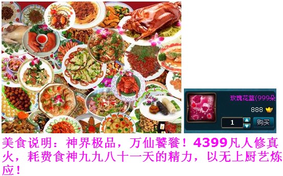 第二套:玫瑰版满汉全席。满汉全席+玫瑰花篮999朵(4399凡人修真特有材料)=4399凡人修真“玫瑰版满汉全席”