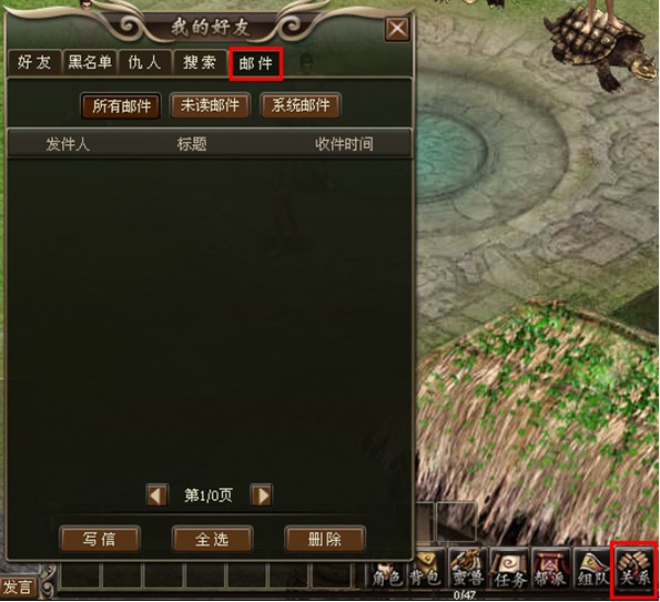 进入4399洪荒神话之后,如果您想发信件给别的玩家,可以点击4399洪荒神话游戏界面下方系统栏—“关系”—“邮件”(图1)
