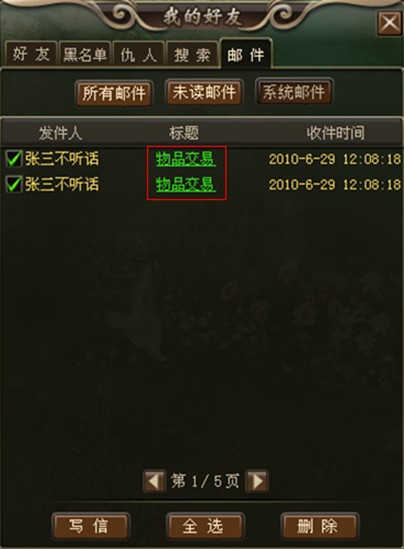 在界面中,我们可以看到有“所有邮件”、“未读邮件”、“系统邮件”“写信”、“全选”、“删除”等按钮,接受到的邮件,我们可以一目了然的看到“发件人”、“标题”、“收件时间”等内容。