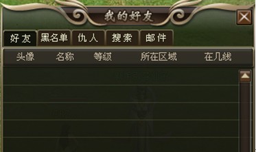 一、好友系统简介:进入4399洪荒神话游戏界面,可以在界面下方的游戏系统栏找到“关系”图标。点击,可以弹出“我的好友”窗口。里面有“好友”,“黑名单”,“仇人”,“搜索”,“邮件”等功能。在4399洪荒神话中成功添加的好友,可以看见好友的头像,名称,等级,所在的地图和线路(图1):