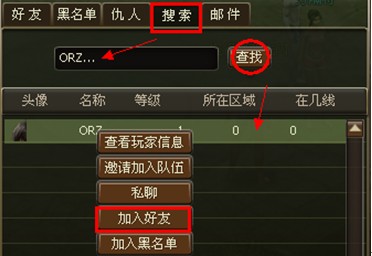 搜索”:主要用于搜索玩家,查看某一玩家的信息,或进行添加好友、添加组队、私聊、加入黑名单等操作