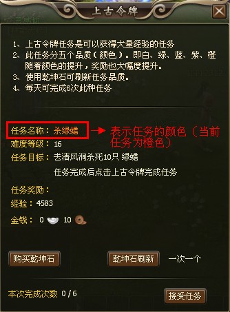 3.在“接受任务”之前可以使用乾坤石改变任务的颜色。每使用一个乾坤石,可以改变一次任务