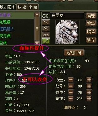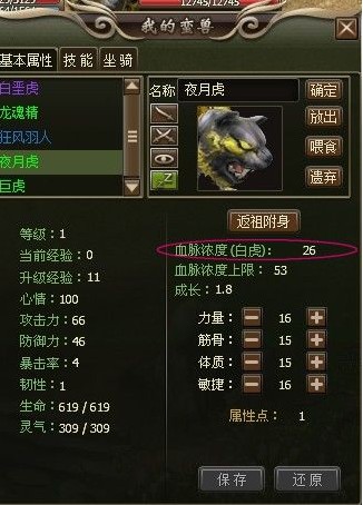 大家可以看出来,同样是1级的蛮兽,血脉度高的巨虎的原始属性也是比月夜虎高的(所以即使是等级玩家,也是很有希望抓到好宠的)