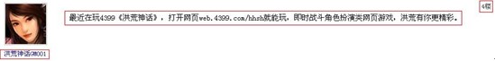 指定签名3:最近发现个好游戏叫洪荒神话的,组队来玩啊。官网http://web.4399.com/hhsh/