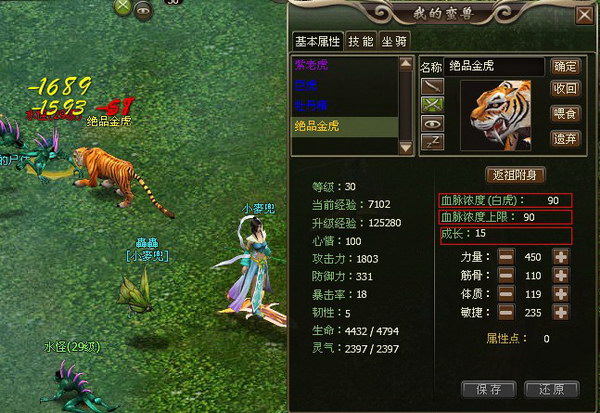 从该玩家的截图上看,其所捕获的超级宠物为极品的橙色金毛虎,目前等级30级,血脉浓度上线90,当前血脉90,成长值15,两种初始属性都已达到顶峰。据Chua Yeo Toh介绍,她抓捕到金毛巨虎的时候该老虎的初始属性为:血脉68、成长5.4 无论从哪些方面看,这只神兽都是目前游戏内绝对巅峰宠物,预计在一年之内没有任何一只宠物能超越之。