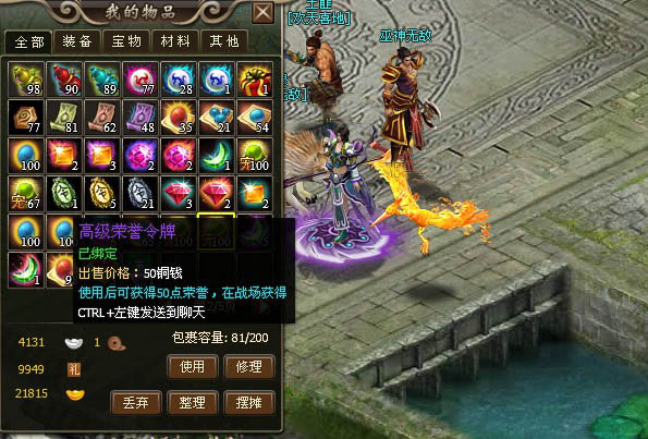 杀死不低于自己10级的玩家会获得荣誉值,杀死等级越高的玩家获得的荣誉值越多,每天杀死同一玩家10次以上就不会再获得荣誉值。荣誉值可以去荣誉商店换取珍贵的装备和物品。开放时间内可以进入战场,在战场里击杀怪物和玩家会获得荣誉值和珍贵的物品。