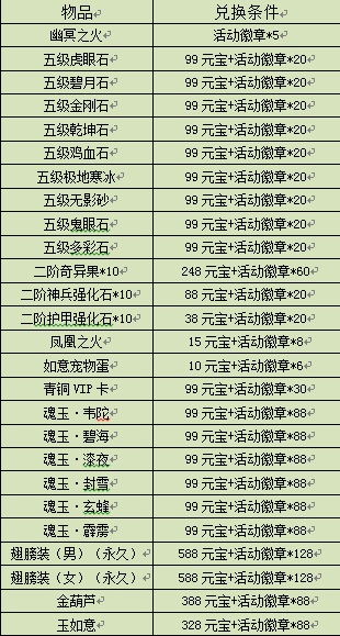 活动期间,可于活动兑换处兑换各种给力道具,如下: