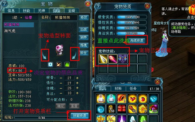 宠物栏也给玩家们带来了极大的便捷体验,驯养宠物,洗练宠物将随时随地都可以进行,打开宠物版面之后(可以从二重常用栏进入),可以看到传统游戏宠物栏的基础属性,资质和宠物品质等等,九天仙梦的宠物栏还增加了宠物全方位的转面查看,更重要的是宠物洗练和技能学习等也都可以在宠物栏里进行。宠物栏中技能资质,弹出洗练和技能学习版面,可以在这里对自己的宝宝进行还童洗练,技能学习等各种操作,宠物的成长值决定其成长品质。资质和属性决定宠物的战斗能力。
