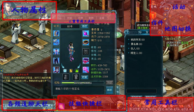 在保持传统用户习惯的前提下,4399九天仙梦深度优化了游戏的操作界面,界面布置方面,技能快捷栏,常用工具栏,各种频道的聊天栏目以及角色属性栏等都按照玩家的用户习惯来进行设置的,在这些常规栏目中们还有一些二重工具栏可以让玩家有选择的调整和设置,例如打开角色栏之后玩家可以从这里直接进入其他任何常用栏。选择右下角的“其他”可以调出系统设置栏和帮派,挂机等多种功能。