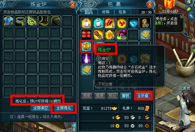 传统的用户习惯必须遵守,在操作上给玩家献上新体验也是九天仙梦原创的重要内容,背包的设计和宠物栏的设计就是用户新体验的两个常用操作。该游戏中,玩家不用再担心自己因为背包小,与收购材料的NPC距离过远而不得不丢弃一部分道具和装备的困惑,背包中将再增加折叠,摧毁以及首创的炼金炉功能,只需要打开一个炼金炉,将自己多余的道具扔进炉中,就可以兑换成银两了。