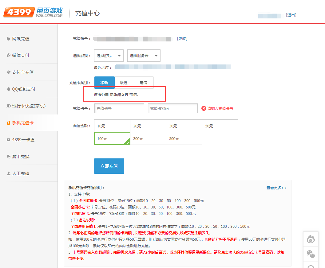 3、购买的移动充值卡已经将一半的费用充值手机话费,可以使用这张卡的余额充值4399游戏吗?