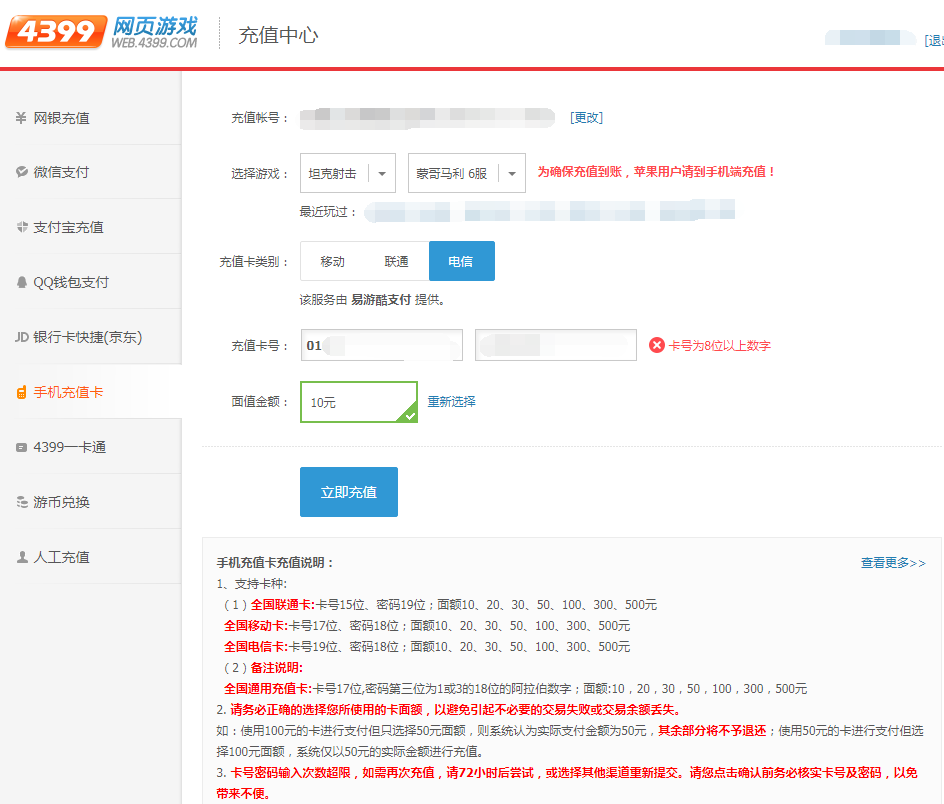 第二步:充值资料填写游戏名、区服(角色名)、金额、卡号以及卡密,填写完毕点击“立即充值”。