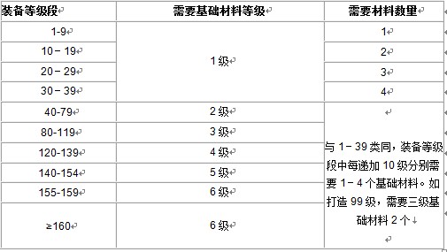 与1-39类同,装备等级段中每递加10级分别需要1-4个基础材料。如打造99级,需要三级基础材料2个