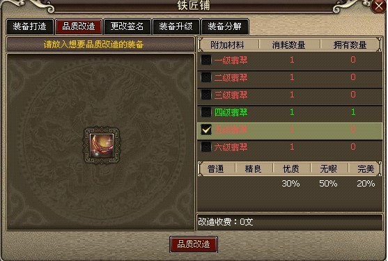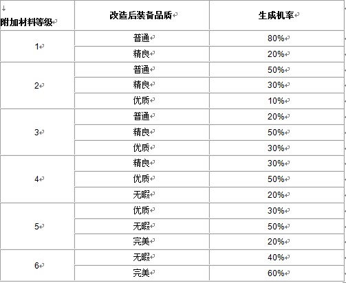 品质改造可将一般或是精良装备改造为完美装备(由附加材料等级决定),经过改造的装备品质有大幅提升。所需材料同附加材料,材料等级越高,装备改造的品质越高,以下为各级附加材料改造装备。