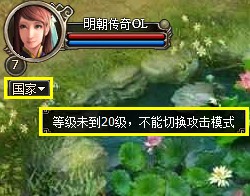 在游戏左上角点击国字,切换PK模式,需要等级达到20级才可以切换攻击模式哦: