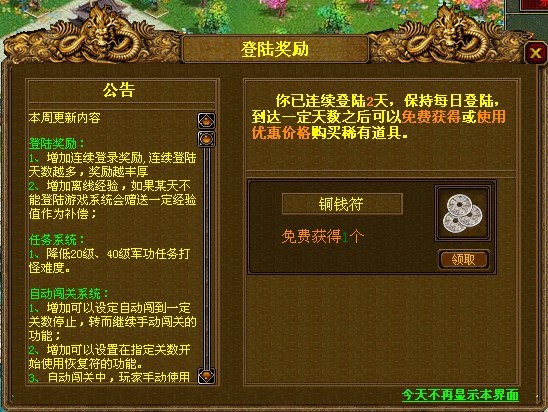 每天持续登录游戏的玩家,每天第一次登陆游戏的时候会看到下图中的弹窗