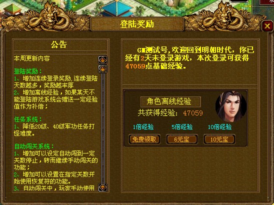 为了让因故无法每天登陆游戏的热心玩家们减少在游戏中落后的顾虑,4399明朝时代决定推出离线经验奖励。