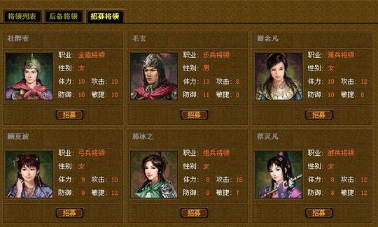 职业化军人的系统设定“将领”,是4399明朝时代的核心玩法之一。征战明朝时代,你不再孤单,明朝时代有着多种职业的将领供你选择。将领的素质决定了一支军队的素质,统帅能力越高,将领可以统帅的士兵数量越多!