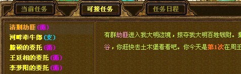 4399明朝时代的任务界面分为“当前任务”、“可接任务”和“任务日程”。“当前任务”:显示的是玩家已经接受后完成和未完成的任务;“可接任务”:显示的是玩家当前等级可以接到的任务;“任务日程”:显示的是循环任务的相关信息。