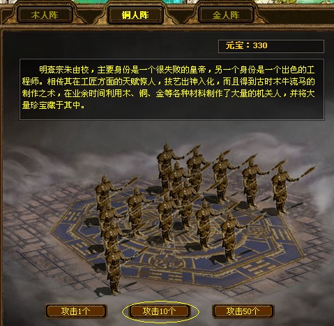 如果你是一个稍微会投一点RMB进入游戏的玩家,那么“破阵”将会是你发财起步的好地方。小编在这里推荐玩家在“破阵”的“铜人阵”中考验一下个人的RP,这里除了远近闻名的“七煞”套装,还有就是动荡“市场”价格的“白金将领符”,只要“白金将领”能够买到10元宝以上,那就是稳赚不赔了。(详细商业信息小编我还是进行不要透露太多了吧,免得影响各位已经修成正果的明朝时代奸商大大们)