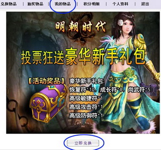 单击“立即兑换”,然后在主菜单中选择“我的物品”,很快你就可以看到礼包的激活码了。接着登录4399明朝时代官网:http://web.4399.com/mcsd/ 找到活动公告页面,点击“激活码兑换豪华礼包地址”进入该页面,之后的事情地球人都会操作啦。