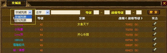 4399明朝时代的“攻城战”,顾名思义就是说玩家可以于界面点击“攻城”图标,进入“攻城战界面”,其中显示你当前等级可以对战的玩家名单,“攻城战”是有等级阶段限制的,分别是20-39级、40-59级、60-79级、80-100级,玩家们不可以攻击到等级阶段以外的玩家(只有20级以上的玩家才能进行“攻城战”,新手们先要对战就赶快升级吧)。