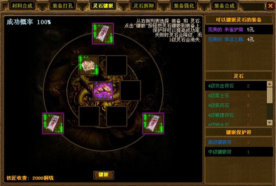 装备有孔后当然是镶嵌上极品的灵石了(至少也得镶嵌4级以上的吧),装备上每个灵石孔的镶嵌成功4399都是25%,不想昂贵的灵石降级或则消失,小编我还是乖乖地贴上了“镶嵌符”啊,以免发生更大的悲剧啊。(兜里的RMB泪流满面)