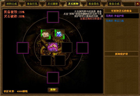 什么?你装备的灵石镶嵌错了吗?那么就得进入“灵石拆卸”界面了,想要拆卸装备上的灵石,当前4399明朝时代的版本必须使用至少一个“拆卸保护符”才能操作(保护了玩家们珍贵的装备啊),之后只有4个“拆卸保护符”的位置填满,拆卸的成功率才会达到100%。(所以镶嵌灵石之前就要想好,不然就要到这个冷门、恶心加痛心的功能界面跟自己的RMB开玩笑啦)