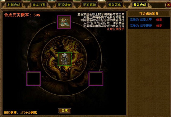 但是世界上是没有免费的午餐的,想要合成理想的装备,必须符合以下条件:1、参与合成的装备必须是蓝色品质以上;2、装备必须是没有灵石镶嵌的(与开孔与否无关);3、中间一格为未来想要合成目标装备的具体部件位置,外围的空格便是合成装备的套装系列,外围三件装备必须是同一系列,每件装备都会提升合成装备达到完美的25%的。(好在合成装备是没有失败设定的,不然小编我翻桌子的老毛病又要发作了)