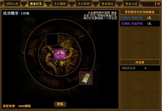 玩家们只要选到要开孔的目标装备,然后可以到“商店”出买到开孔道具“初级开孔符”和“中级开孔符”,便可以化为一些铜钱来给装备打孔了。一件装备最多可以打六个孔,开始的二个孔的成功率为100%,之后的每两个孔成功的4399会逐级降低,分别为50%和25%,而且依靠的“开孔符”等级也会升高,费用增加,具体数据可以在界面的左边显示。(哎,可怜了小编我兜里的RMB啊)